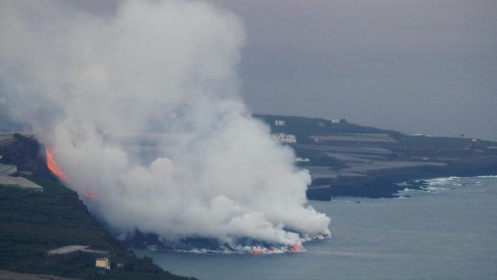 La lava que emana de la erupción en la isla española de La Palma y que cae al mar desde la pasada noche creo un “enorme delta” de aproximadamente medio kilómetro de ancho, mientras que el océano a su alrededor cambió de color por los efectos del material volcánico.