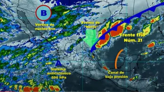 La masa de aire polar que impulsa al sistema frontal dejará también lluvias fuertes en los estados del sureste, incluida la Península de Yucatán, según informó el Servicio Meteorológico Nacional (SMN)