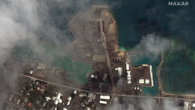 Una gruesa capa de cenizas cubre las islas, mostraron las imágenes aéreas proporcionadas a Tonga por Nueva Zelanda y Australia. El aeropuerto principal del archipiélago no sufrió daños, pero la caída de cenizas complica las operaciones, lo que dificulta los esfuerzos de socorro internacional.