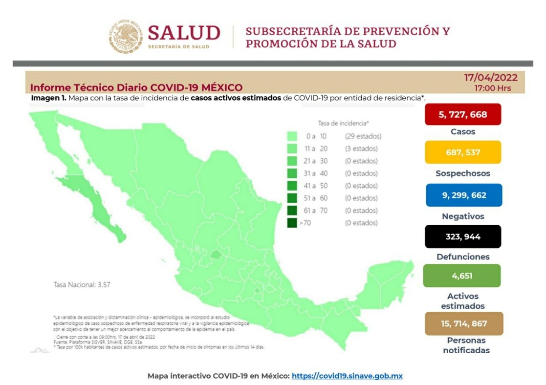 Agregó que al inicio de la semana epidemiológica del 3 al 9 de abril, hubo un descenso de casos de covid de 28 por ciento, y precisó que el número de casos estimados es de 4 mil 651, lo cual representa el 0.08 por ciento de los que se han reportado desde el comienzo de la pandemia.