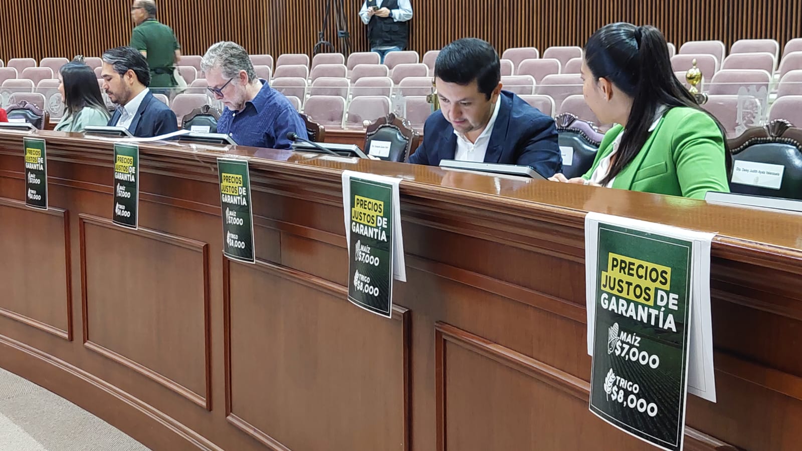 Los legisladores mostraron pancartas en sus curules durante la sesión extraordinaria de este miércoles, mientras se desarrollaba una mega protesta en la entidad para pedir al gobierno federal que se otorgue el precio de 7 mil pesos por tonelada de maíz y 8 mil pesos por tonelada de trigo.