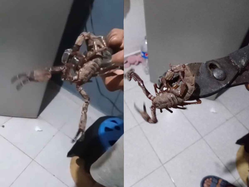 Un habitante del lugar, identificado Arcángel Gabriel difundió las fotografías de un colosal alacrán, que logró atrapar con unas pinzas que merodeaba dentro de su casa.