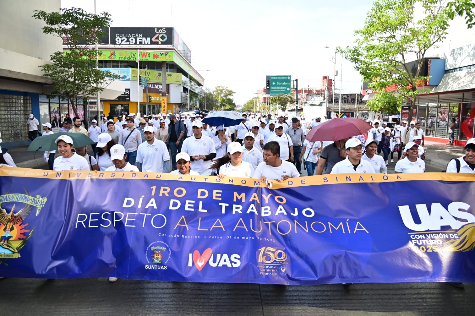 Culiacán, Sin.- En pie de lucha y cercanos a celebrar los 150 años de fundación de la Universidad Autónoma de Sinaloa (UAS), miles de trabajadores universitarios, tanto administrativos como académicos, participaron en el desfile del Día del Trabajo para al unísono decir “ya basta a los atropellos de la Autonomía Universitaria”.