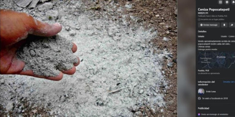 Mediante la herramienta de Marketplace en Facebook, un usuario que se hace llamar Erick Luna compartió que se encuentra vendiendo ceniza del Popocatépetl, la cual oferta en 11 mil pesos.