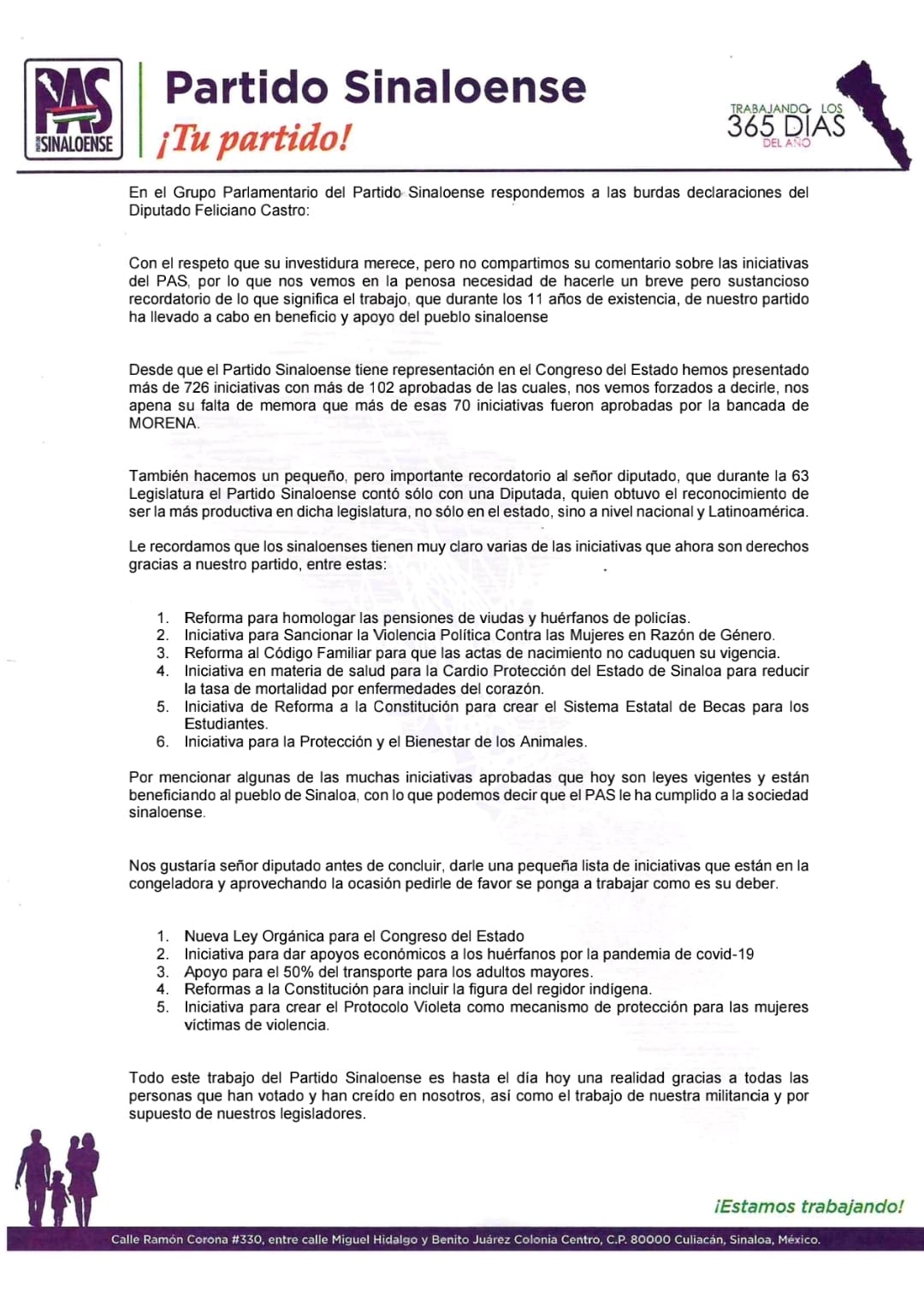 Culiacán, Sin.- A través de un comunicado, los diputados integrantes del Grupo Parlamentario del Partido Sinaloense (PAS) respondieron a las declaraciones del presidente de la Junta de Coordinación Política (JUCOPO), Feliciano Castro Meléndrez, advirtiendo que se trata de un posicionamiento burdo y carente de sustento.