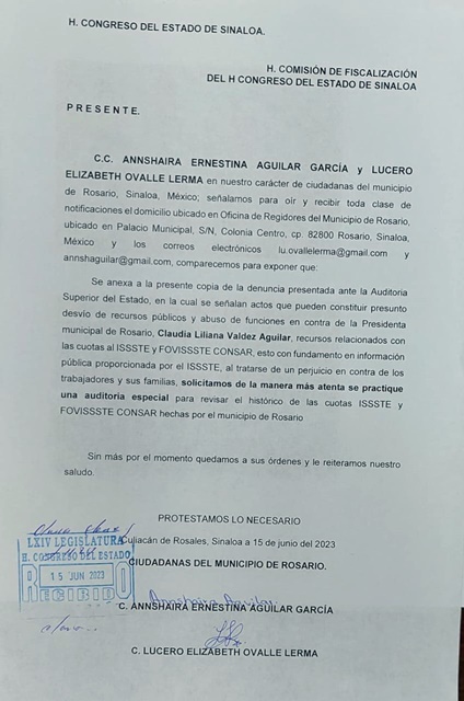 De igual forma, se presentó una solicitud de auditoría a la Comisión de Fiscalización del Congreso del Estado de Sinaloa: