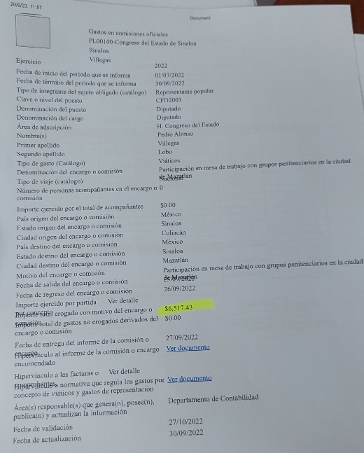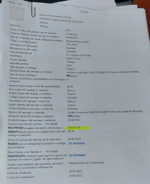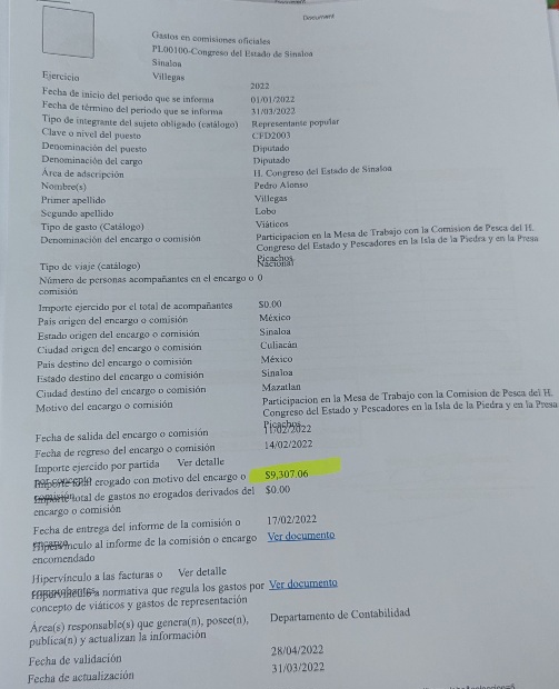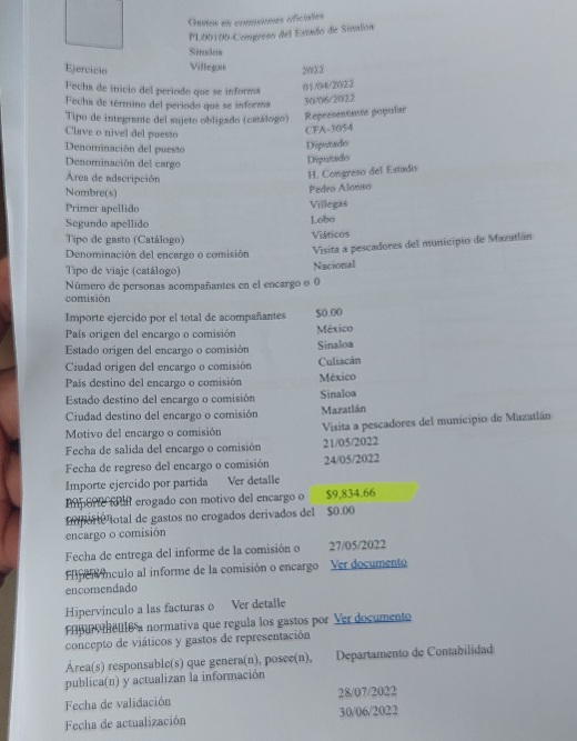 Le dan alrededor de 10 mil pesos en reembolsos mensuales al diputado Pedro Villegas. Reembolsos para ir a Mazatlán, para ir a pasar unos días a algún lugar turístico. Tiene reembolsos que realmente son vergonzosos. Tiene un reembolso de 848 pesos, par aun viaje a Badiraguato, apoco su diera no da para el de su bolsita gaste“.