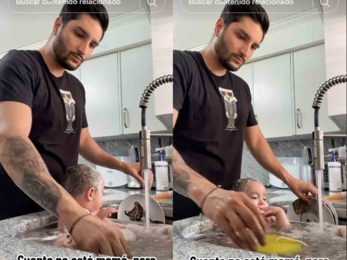 En el clip, aparece el joven padre lavando los trastes, mientras el bebé luce tranquilo y sentadito en el fregadero de la cocina, junto con el agua con la que están lavando la loza.