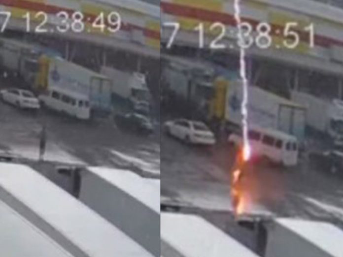 El material muestra cómo la víctima caminaba bajo una tormenta eléctrica, cuando de pronto se deja ver la aparición del relámpago, que no solo mató al sujeto, sino que también hizo estremecer la cámara que estaba situada en el estacionamiento de un almacén de verduras.