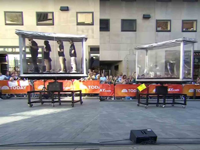 Todo ocurrió en la emisión “Today” cuando el mago seleccionó a cuatro participantes al azar mediante una ruleta de colores, a quienes subió a una estrecha cabina de cristal donde les pidió cubrirse los ojos y sostenerse de las paredes transparentes.