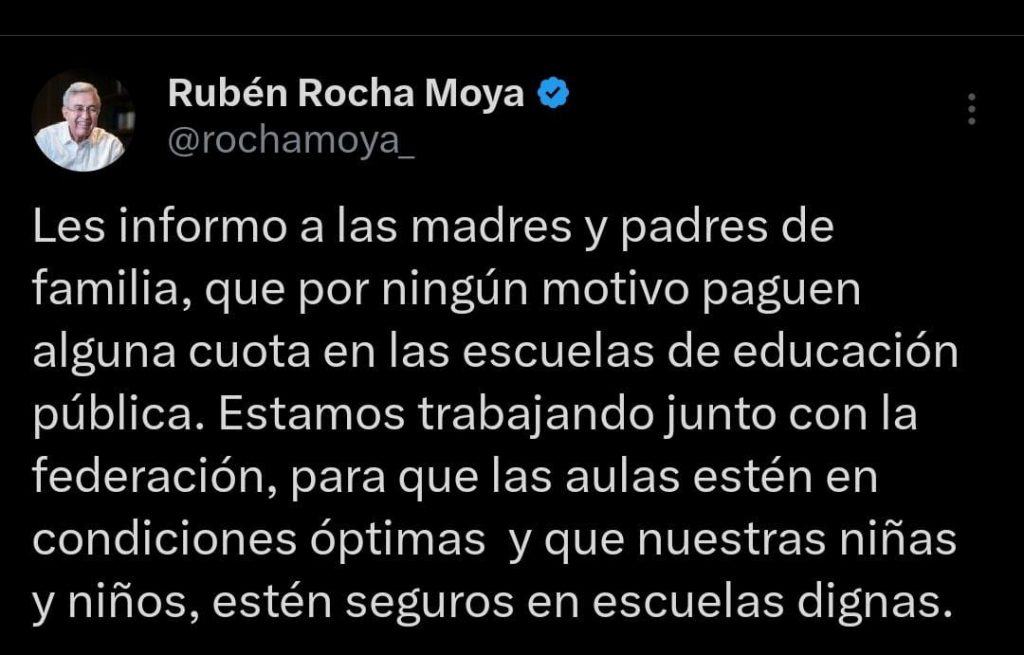 Asimismo, el diputado José Manuel Luque respaldó el llamado del gobernador Rubén Rocha Moya a madres y padres de familia, para que no realicen pagos de cuotas en las escuelas de Educación Básica y denuncien si la entrega de libros o el ingreso de sus hijos al plantel es condicionado.