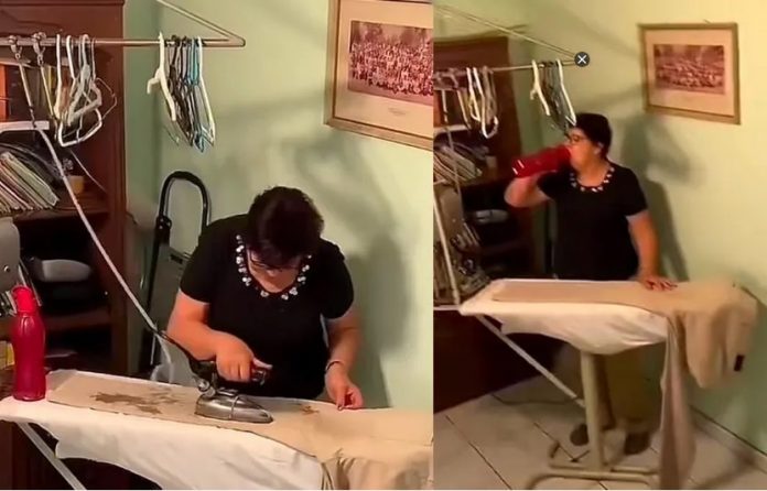 Al inicio todo parecía normal hasta que la mujer toma un trago de agua de una botella que se encontraba a su alcance e inmediatamente después escupe el agua encima de un pantalón para después pasarle la plancha por encima.
