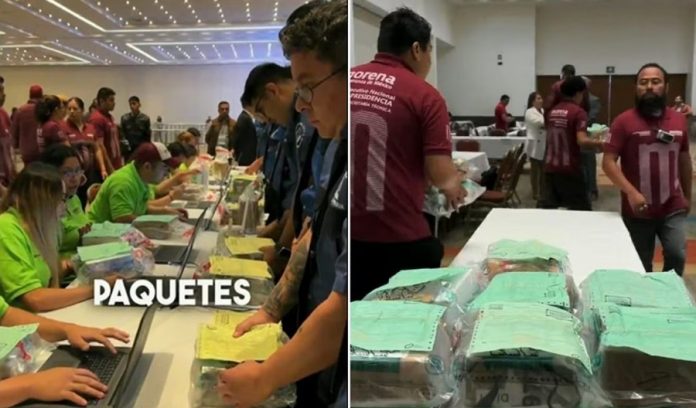 Previo al conteo, se realiza la inspección física de los paquetes que contienen las urnas con las boletas de la encuesta que definirá al coordinador o coordinadora de defensa de la #4T.