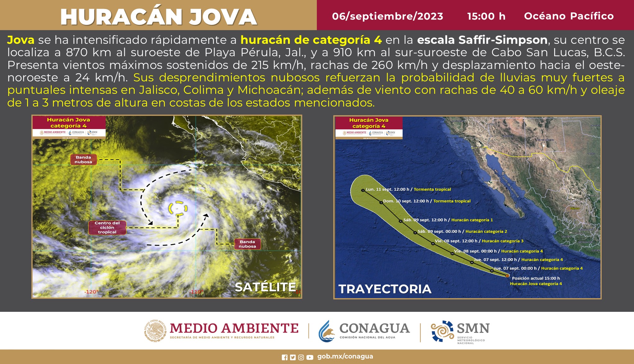 El Servicio Meteorológico Nacional, que es la dependencia oficial del Gobierno de México, perteneciente a la Comisión Nacional del Agua, encargada de mantener al tanto a la población de estos fenómenos naturales y alertar cualquier posible riesgo, informó que el Huracán Jova en el Océano Pacífico provocará lluvias muy fuertes e intensas.