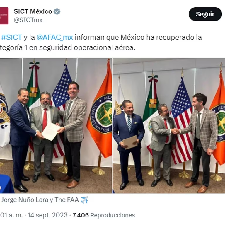 Asimismo, el titular de la SICT envió un reconocimiento para los especialistas y autoridad nacional, la Agencia Federal de Aviación Civil, que estuvo involucrada en los trabajos para garantizar las mejoras para que el país tuviera la Categoría 1.