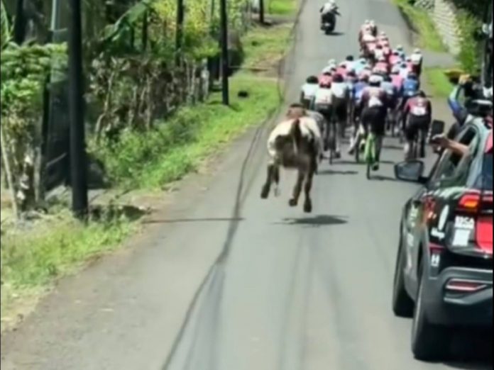 Cuando el animal decide entrar a competir de inmediato se pone a la par de la parte trasera del contingente. La escena luce tan irreal que incluso los vehículos de apoyo deciden grabar el momento de la vaca persiguiendo al resto de los ciclistas, como si quisiera remontar en la competencia.