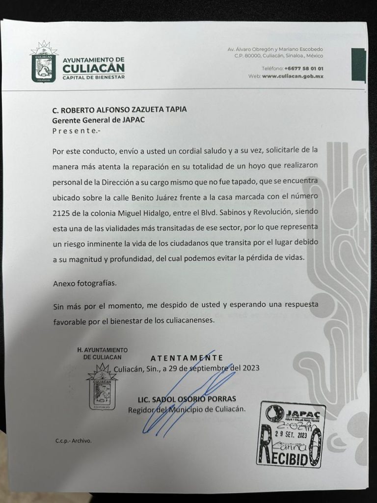 El regidor Sadol Osorio solicitó de manera formal la reparación de un hoyo que realizó el personal de JAPAC en la colonia Hidalgo, el cual no fue tapado y pone en riesgo a la ciudadanía