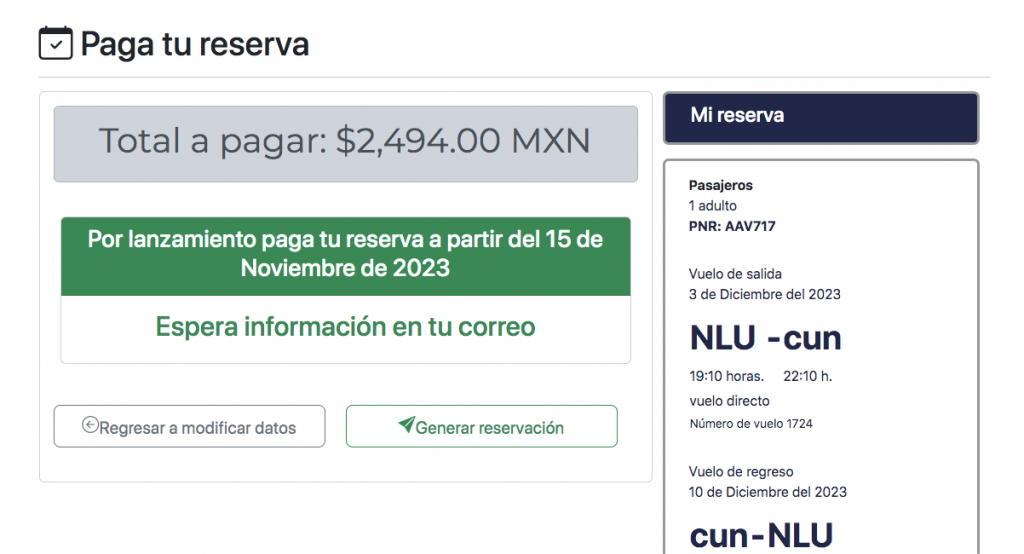 Forbes México hizo todo el procedimiento para adquirir dos boletos del Aeropuerto Internacional Felipe Ángeles (AIFA) a Cancún, Quintana Roo, pero al pagar, sólo apareció un mensaje que decía “Por lanzamiento paga tu reserva a partir del 15 de noviembre de 2023. Espera información en tu correo”.