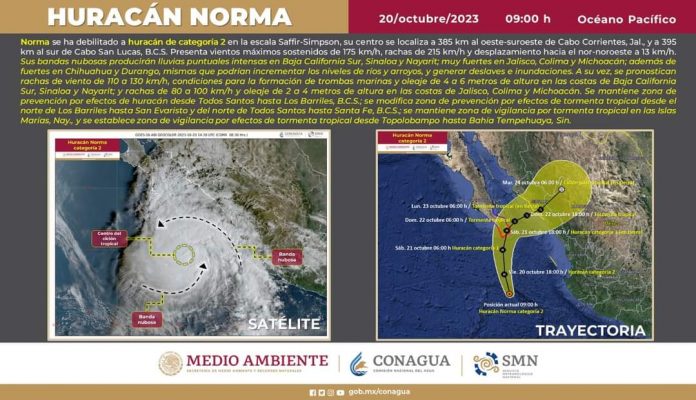 Norma se desplaza hacia el nor-noroeste a 13 kilómetros por hora con vientos máximos sostenidos de 175 kilómetros por hora y rachas de 215 kilómetros por hora, detalló el SMN.
