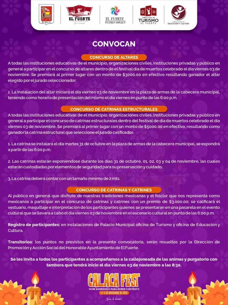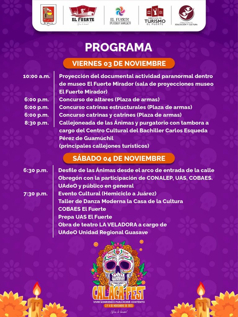 El Fuerte, Sin.- El Ayuntamiento de El Fuerte, a través de las Direcciones de Turismo y Educación y Cultura, invitan a las familias fortenses y visitantes, a disfrutar de los eventos programados en el marco del Calaca Fest 2023, festival alusivo al tradicional Día de Muertos, el cual se estará realizando los días 03 y 04 de noviembre.