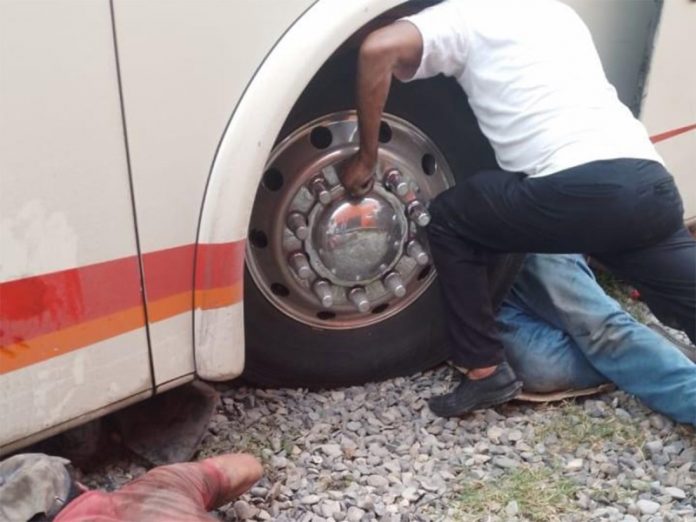Un mecánico, de 50 años de edad, quedó prensado al autobús que revisaba frente a una gasolinera ubicada en Hidalgo; afortunadamente “vivió para contarlo”