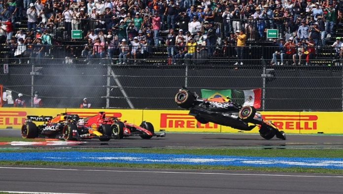 El monoplaza de Checo Pérez estuvo algunos segundos por los aires después de hacer contacto con Charles Leclerc en la primera curva de la primera vuelta del Gran Premio de México 2023.