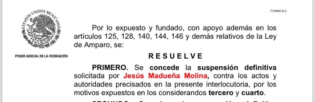 Sin embargo, el Poder Judicial de la Federación determinó conceder la suspensión definitiva a Jesús Madueña para que no sea separado en definitiva de su cargo, por lo que la autoridad responsable podrá dictar otra medida cautelar en tanto reciban la notificación sobre el auto en donde cause ejecutoria la resolución que se pronuncie sobre el fondo del amparo.