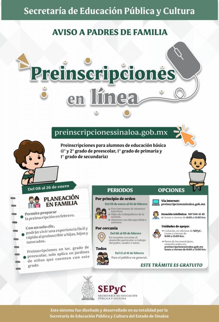 Los padres, madres de familia o tutores ingresarán a la plataforma https://preinscripcionessinaloa.sepyc.gob.mx/, y dar clic en la opción de Planeación, en donde ingresarán los datos de las y los niños que ingresarán a primero y segundo de preescolar, primero de primaria y primero de secundaria y podrán seleccionar hasta 3 opciones de escuelas donde quieren preinscribir a sus hijos.