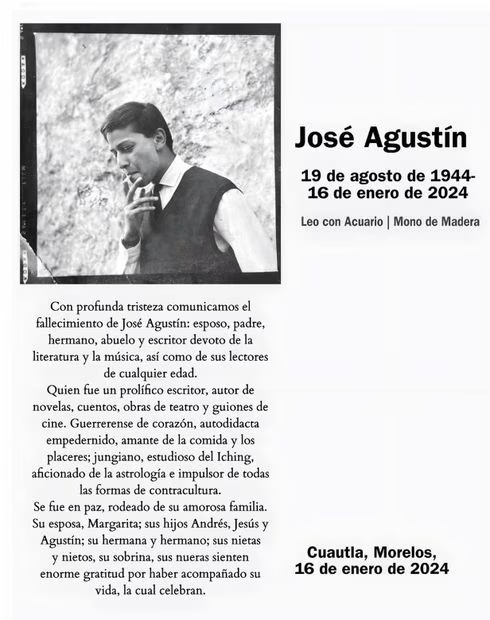 Andrés Ramírez, hijo y editor del escritor, confirmó la lamentable noticia mediante un comunicado oficial. En él expresó: “Con profunda tristeza comunicamos el fallecimiento de José Agustín: esposo, padre, hermano, abuelo y escritor devoto de la literatura y la música, así como de sus lectores de cualquier edad”, dice el mensaje con el que su su esposa, Margarita; sus hijos Andrés, Jesús y Agustín; su hermana y hermano; sus nietas y nietos, su sobrina, se despidieron del escritor a quien definieron como “Guerrerense de corazón, autodidacta empedernido, amante de la comida y los placeres; jungiano, estudioso del Iching, aficionado de la astrología e impulsor de todas las formas de contracultura”. Un hombre de signo Leo con ascendente acuario, y hasta el final descrito como Mono de Madera, en el horóscopo chino.