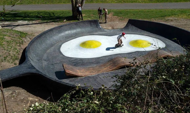 Diseñado por el artista John Holding, el skate park ha sido bautizado como el “Frying Pan Skate Park”. Su diseño innovador presenta un enorme sartén como la pieza central, completo con dos huevos fritos y una tira de tocino.