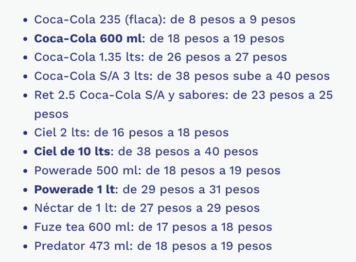 De acuerdo con listas distribuidas en los establecimientos, los incrementos de precios entran en vigor a partir de este miércoles, con los cuales, algunas presentaciones de Coca-Cola y otros productos suben de uno a dos pesos, tal es el caso de agua Ciel.