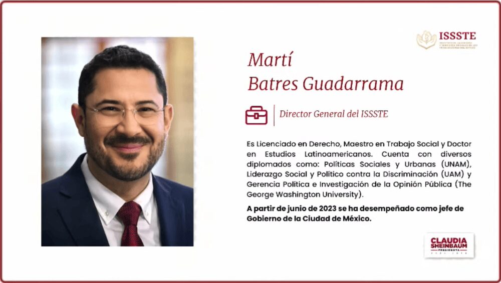 Sheinbaum Pardo informó que Batres será, a partir del próximo 1 de octubre, el director general del Instituto de Seguridad y Servicios Sociales de los Trabajadores del Estado (ISSSTE).