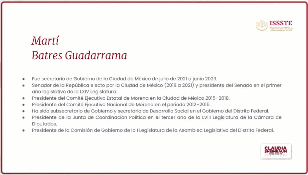 La presidenta electa de México, Claudia Sheinbaum, anunció la mañana de este miércoles que el actual jefe de gobierno de la Ciudad de México, Martí Batres, se sumará a su gabinete, como el nuevo director del ISSSTE y coordinador del FOVISSSTE.