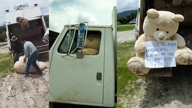 Trabajador de Servicio Municipales de Arroyo Seco, Querétaro, compartió en sus redes sociales un video donde se muestra al osito de peluche que él y un compañero de trabajo, se encontraron mientras recolectaban la basura del municipio.
