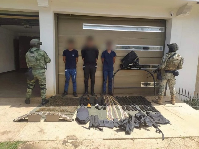 Por lo que el personal militar y elementos de la Secretaría de Seguridad Pública ingresaron a un domicilio particular en la cabecera municipal de Berriozabal, donde detuvieron a 3 hombres a los que se les aseguró 4 armas de alto calibre, 2 mil 690 cartucho útiles, 41 cargadores para fusil así como equipo táctico y 2 vehículos.