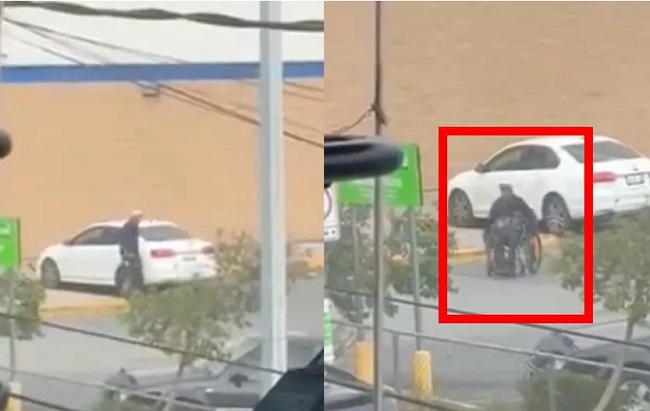 Sin embargo, al abrir la cajuela saca una silla de ruedas, por lo cual en algún momento podría esperarse que ayudara a su acompañante a subirse, pero lo impactante es que realmente era para él dicha herramienta.
