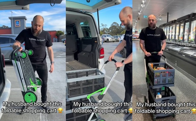 @olivialaurawhite Now it’s his turn for the random purchases 😂 I must say, his are a bit more practical 😆 @Clax Cart Australia Do we rate it?! 😜 #shoppingcart #foldableshoppingcart #aldi #claxcart ♬ original sound – Olivia White
