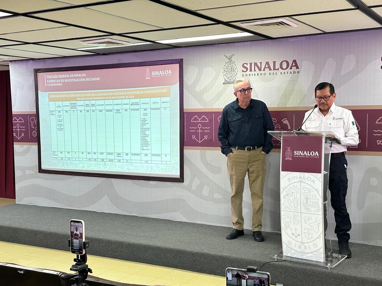 Durante su participación en la conferencia Semanera, encabezada por el gobernador, Rubén Rocha Moya, el encargado de la seguridad en la entidad, detalló que, de acuerdo a datos de la Fiscalía General de la República, suman un total de 164 personas detenidas del 9 de septiembre a la fecha, estas correspondientes a delitos del fuero federal.