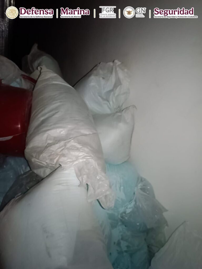 En la segunda acción, al realizar labores de seguridad en el municipio de Ahome, los efectivos notaron la presencia de hombres que portaban lo que parecían armas de fuego, los cuales emprendieron la huida e ingresaron a dos domicilios, al dar continuidad a la persecución, los agentes ingresaron a las propiedades, en una de ellas hallaron 11 bultos con aproximadamente 300 kilos de fentanilo, básculas, revolvedoras industriales y en la otra una camioneta con más de 800 kilos de la misma droga.