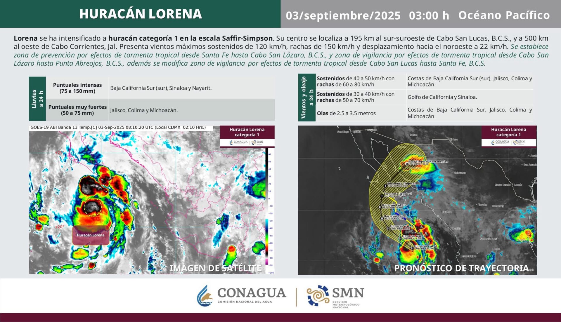 El fenómeno meteorológico se localiza a 195 kilómetros al sur-suroeste de Cabo San Lucas, Baja California Sur, y registra vientos sostenidos de 120 km/h con rachas de hasta 150 km/h. Mantiene un desplazamiento hacia el noroeste a una velocidad aproximada de 22 km/h.