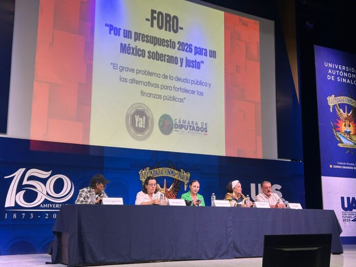 Culiacán, Sin.- La propuesta de suspender la deuda pública y externa de México para una renegociación, fue presentada por la maestra, Mónica Soto Elizaga, integrante de la Promotora por la Suspensión de la Deuda Publica de México, durante el foro *Por un presupuesto 2026, para un México soberano y justo”.