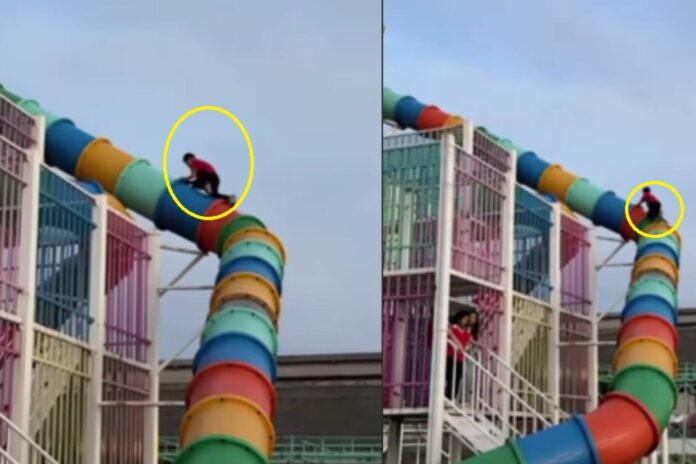 En lugar de subir al tobogán por la forma habitual, el pequeño decidió escalar por fuera, mostrando una actitud aventurera y arriesgada que puso nerviosos a varios espectadores.