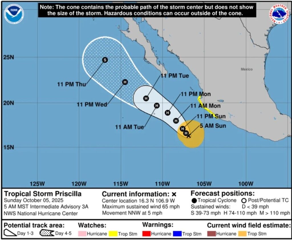 La tormenta tropical Priscilla continúa fortaleciéndose frente a la costa suroeste de México y podría convertirse en un huracán de gran tamaño en las próximas 24 horas, informó el Centro Nacional de Huracanes de EE.UU. (NHC, por sus siglas en inglés) en su boletín intermedio de las 5:00 a. m. MST (12:00 UTC) de este domingo.