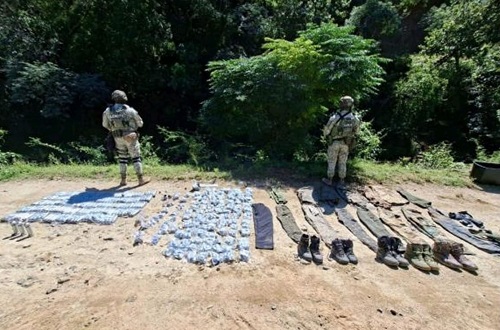 Elementos del Ejército Mexicano, en coordinación con la Guardia Nacional, la Secretaría de Marina, la Secretaría de Seguridad y Protección Ciudadana, la Fiscalía General de la República, la Fiscalía General del Estado y la Secretaría de Seguridad Pública de Sinaloa, a través de la Policía Estatal Preventiva, localizaron en el municipio de Badiraguato un campamento donde se aseguraron cargadores, cartuchos, drones, material táctico, material para elaborar artefactos explosivos y un área de almacenamiento de sustancias químicas.