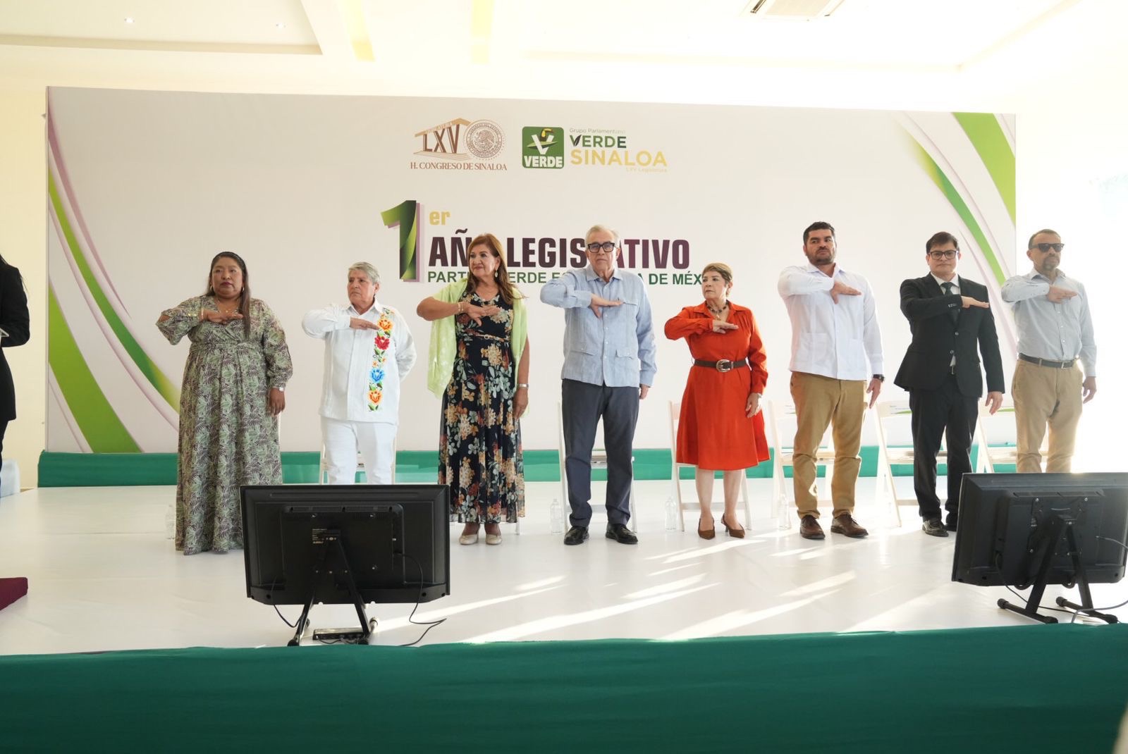 Guasave, Sinaloa.- Previo a realizarse el ejercicio de transparencia y rendición de cuentas en la capital sinaloense, los Diputados del l Grupo Parlamentario del Partido Verde Ecologista de México de la Sexagésima Quinta Legislatura en el Congreso del Estado de Sinaloa, en presencia del Gobernador Rubén Rocha Moya, rindieron su Primer Informe Legislativo en Guasave, en el que destacaron los avances de este primer año de ejercicio constitucional en materia de seguridad, derechos humanos y justicia social.