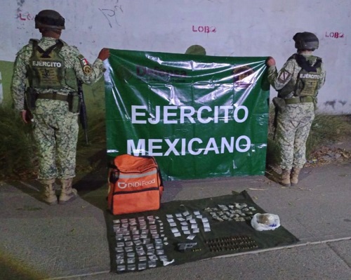 Durante reconocimientos terrestres en las inmediaciones de la avenida de Los Balcanes y esquina con Cordilleras de las Rocas, en la colonia Villa Bonita, el personal militar localizó una bolsa tipo hielera usada para repartir alimentos con lo siguiente: