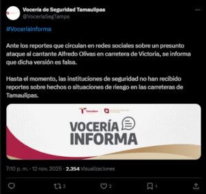 “Ante los reportes que circulan en redes sociales sobre un presunto ataque al cantante Alfredo Olivas en carretera de Victoria, se informa que dicha versión es falsa.Hasta el momento, las instituciones de seguridad no han recibido reportes sobre hechos o situaciones de riesgo en las carreteras de Tamaulipas“, se pudo leer en el comunicado.