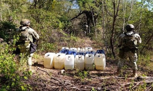 En el marco de la “Operación de Búsqueda, Localización y Destrucción de Laboratorios Clandestinos”, al efectuar reconocimientos terrestres a pie y motorizados en los mencionados municipios, el personal militar localizó las áreas de almacenamiento de precursores y materiales para la elaboración de drogas sintéticas, que contenían lo siguiente: