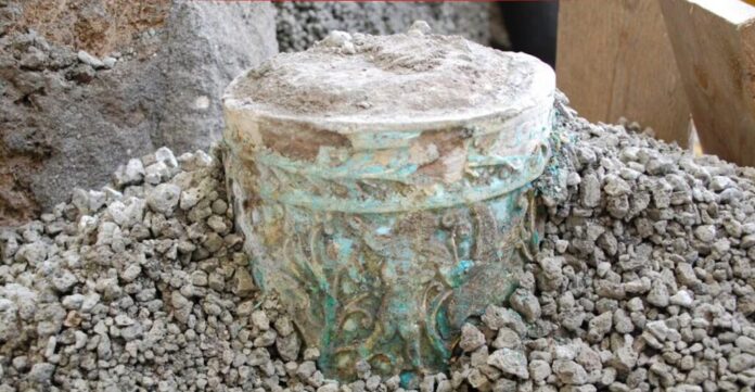 Esta reliquia de pasado fue encontrada en la cocina del Thermopolium de Regio V, y habría sido utilizada como recipiente para guardar alimentos. El Thermopolium era conocido como la zona de comida callejera de la antigua Pompeya, donde se servían comidas y bebidas calientes. Desde el redescubrimiento de la ciudad se han encontrado cerca de un centenar de edificios similares, además de restos de comida, ánforas y frascos para llevar alimentos.