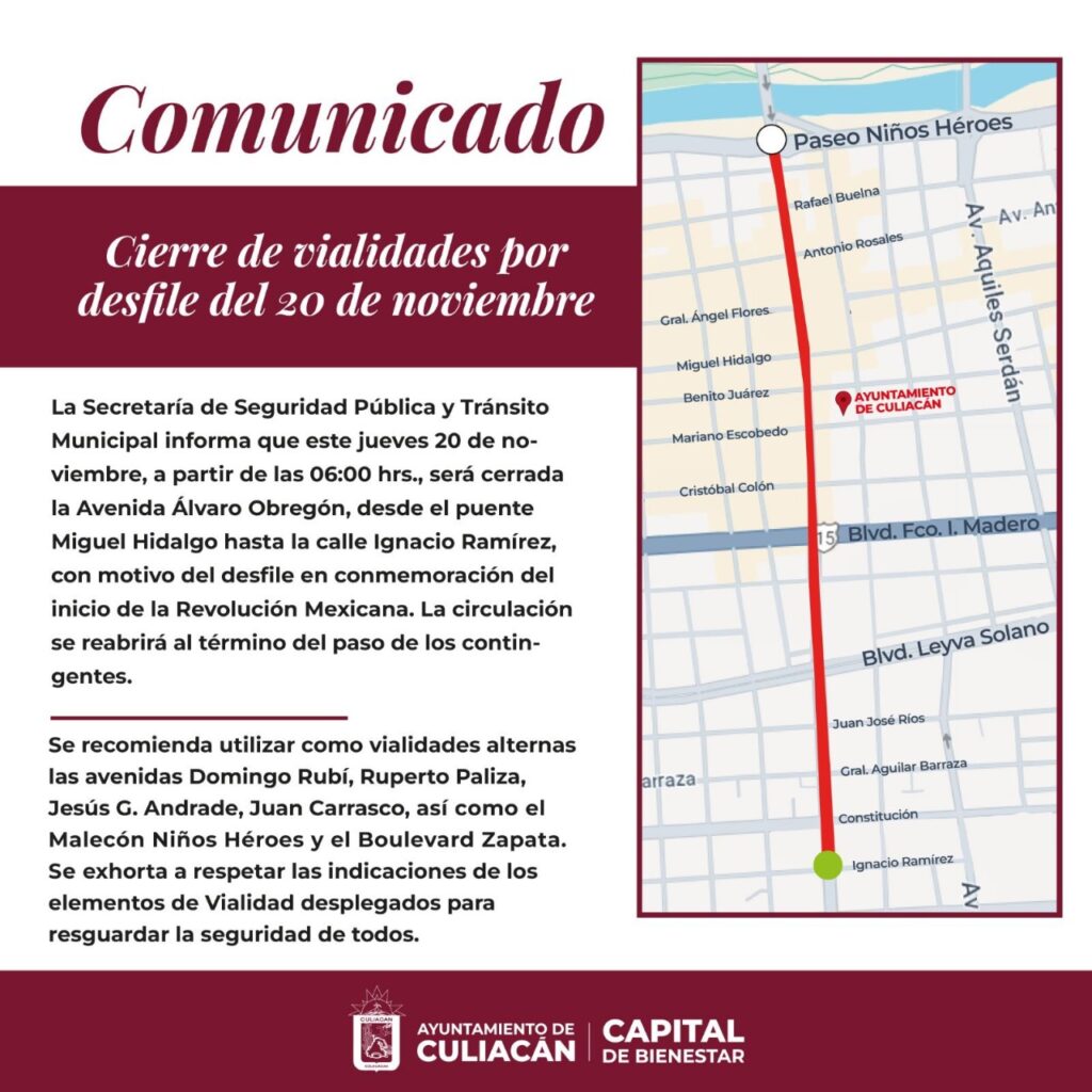 Culiacán, Sin.- Para garantizar la seguridad de asistentes y participantes, así como mantener el orden durante el desarrollo del desfile con motivo del 115 Aniversario de la Revolución Mexicana, la Secretaría de Seguridad Pública y Tránsito Municipal informa a la ciudadanía que este jueves 20 de noviembre se aplicarán cierres y desvíos viales en el primer cuadro de la ciudad.
